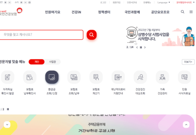 1. 국민건강보험 홈페이지에 접속합니다. 그리고 가운데 메뉴에 있는 환급금 조회/신청을 누릅니다.