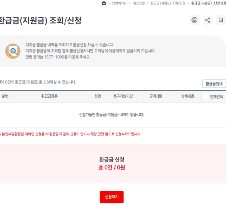저의 경우는 환급금을 과거에 받았기 때문에 현재 신청할 환급금이 없다고 나오는데, 본인의 미지급 환급금 내역이 위 처럼 화면에 나타나니 선택 체크표시를 하고 신청하기를 누르면 됩니다.