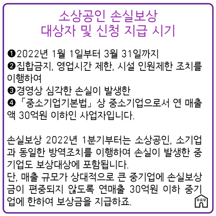 손실보상 2022년 1분기부터는 소상공인, 소기업과 동일한 방역조치를 이행하여 손실이 발생한 중기업도 보상대상에 포함됩니다.